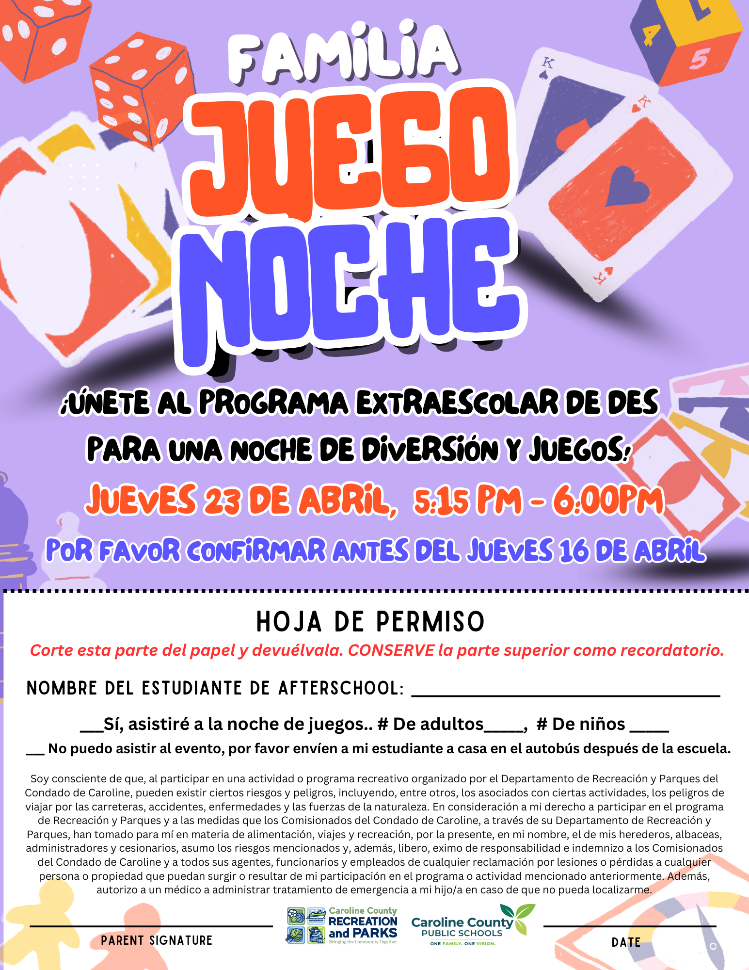 4/23/26: DES Family Night: Family Game Night - 5:15pm - 6:00pm English Flyer | Spanish Flyer