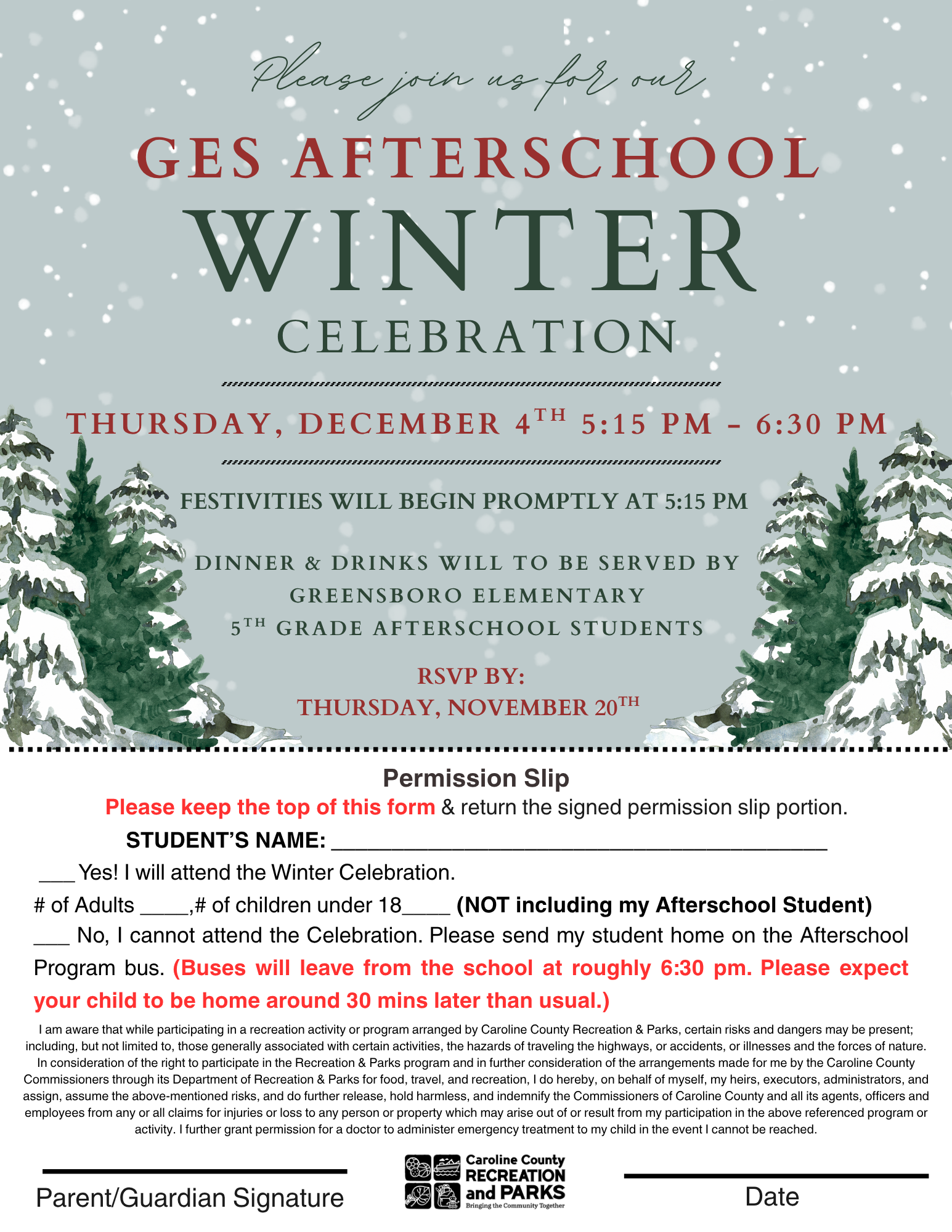 12/4/25: GES Family Night: Winter Celebration - 5:15pm - 6:30pm English Flyer | Spanish Flyer