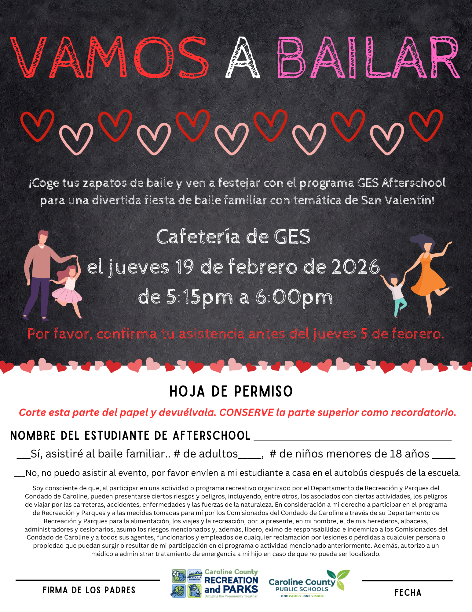 2/19/26: GES Family Night: Valentine's Dance - 5:15pm - 6:00pm English Flyer | Spanish Flyer