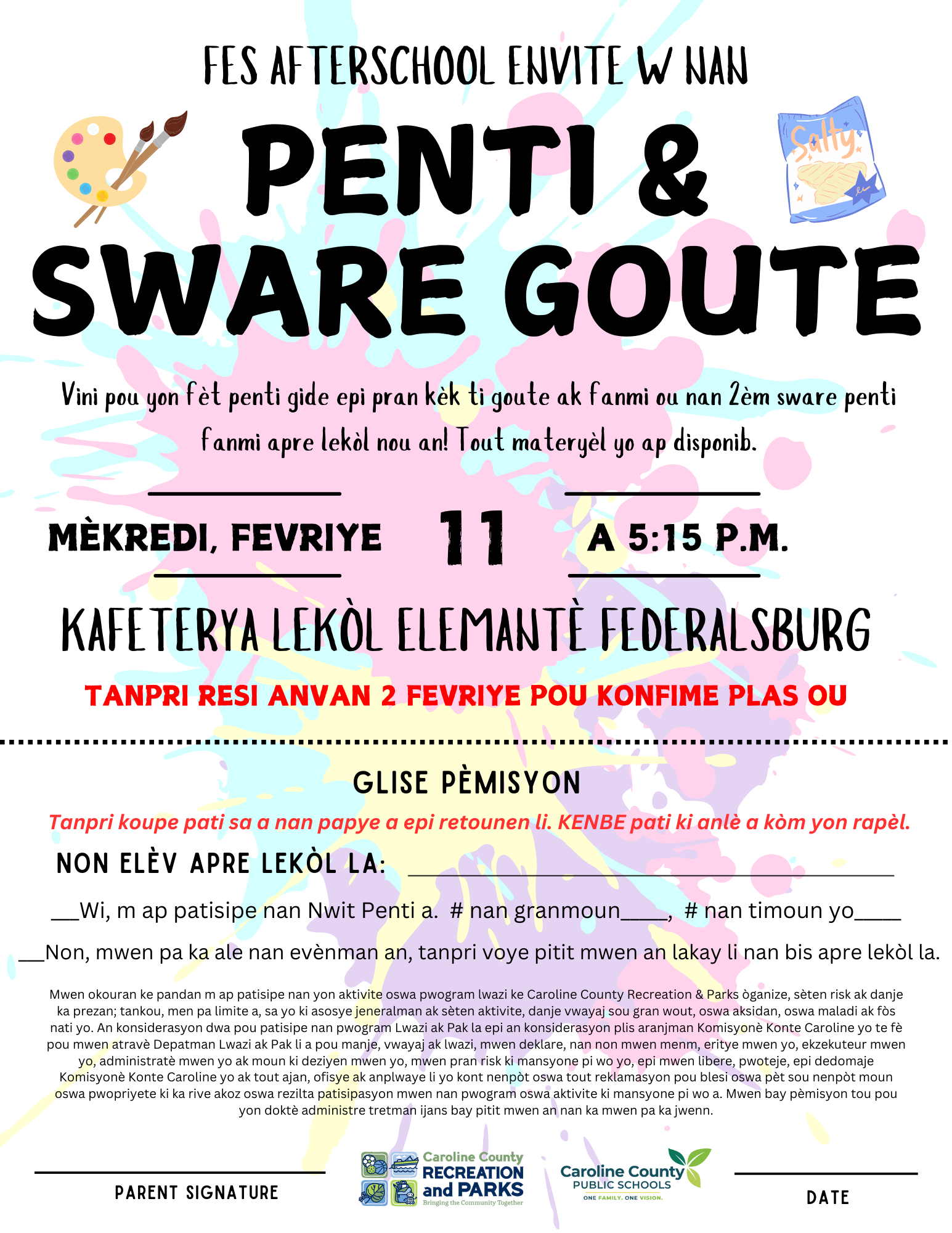 2/11/26: FES Family Night: Paint & Snack - 5:15pm - 6:00pm English Flyer | Haitian/Creole Flyer