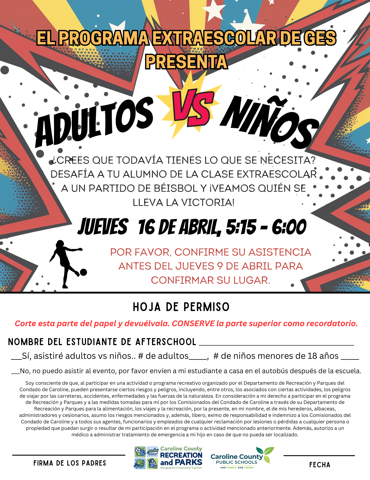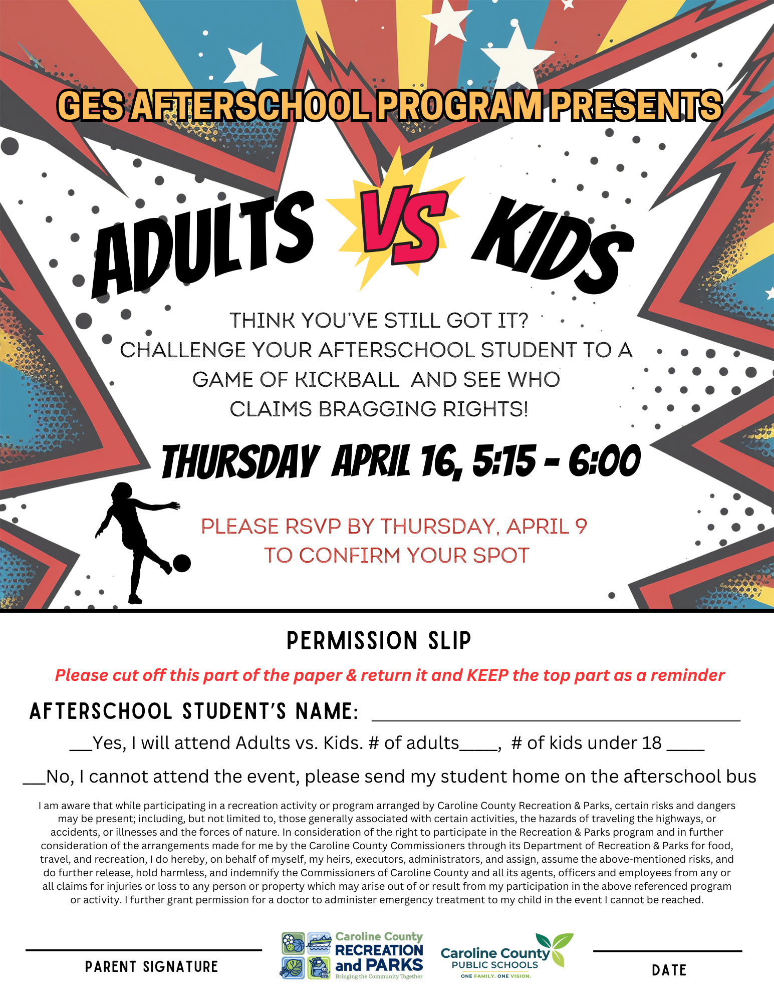 4/16/26: GES Family Night: Adults vs. Kids - 5:15pm - 6:00pm English Flyer | Spanish Flyer