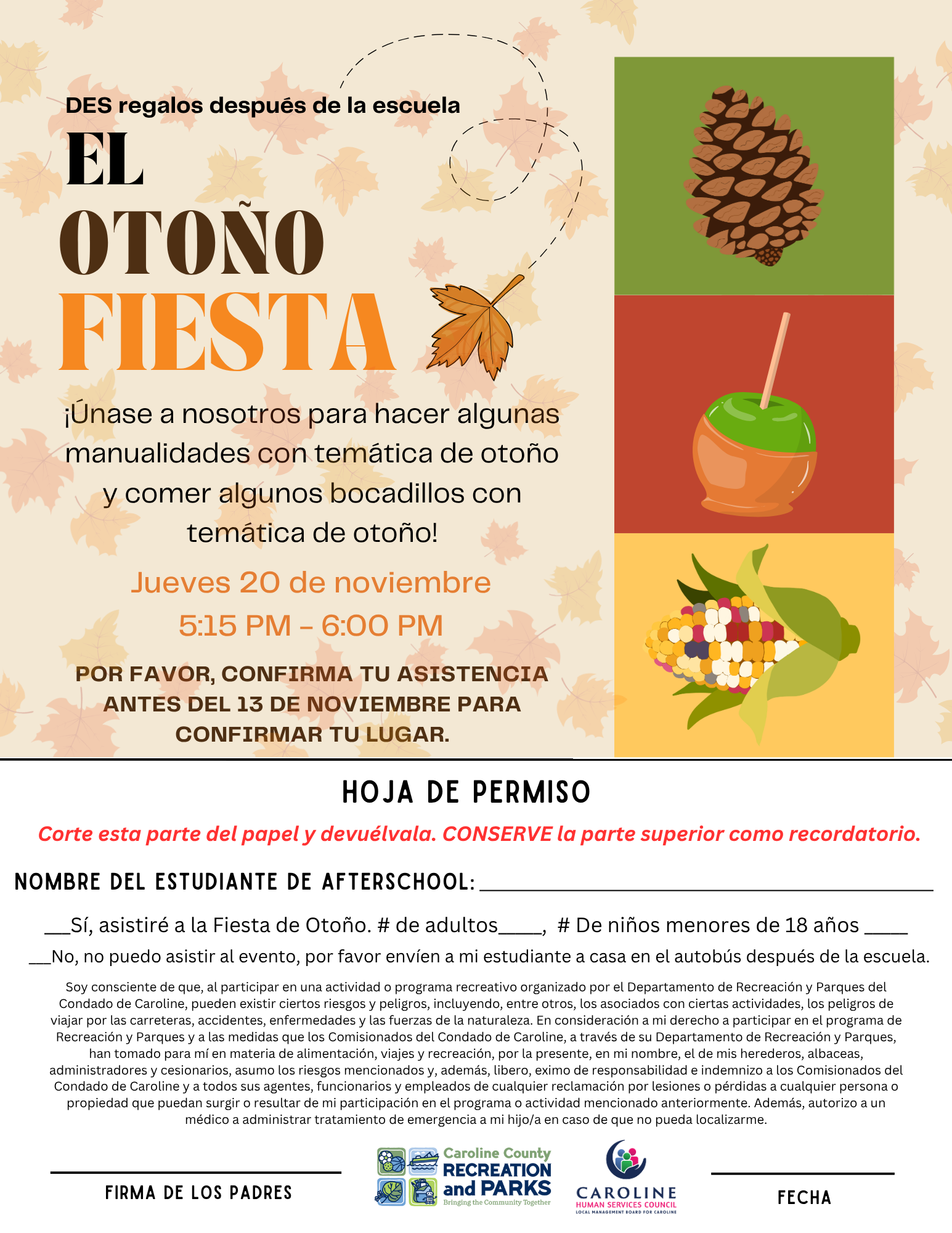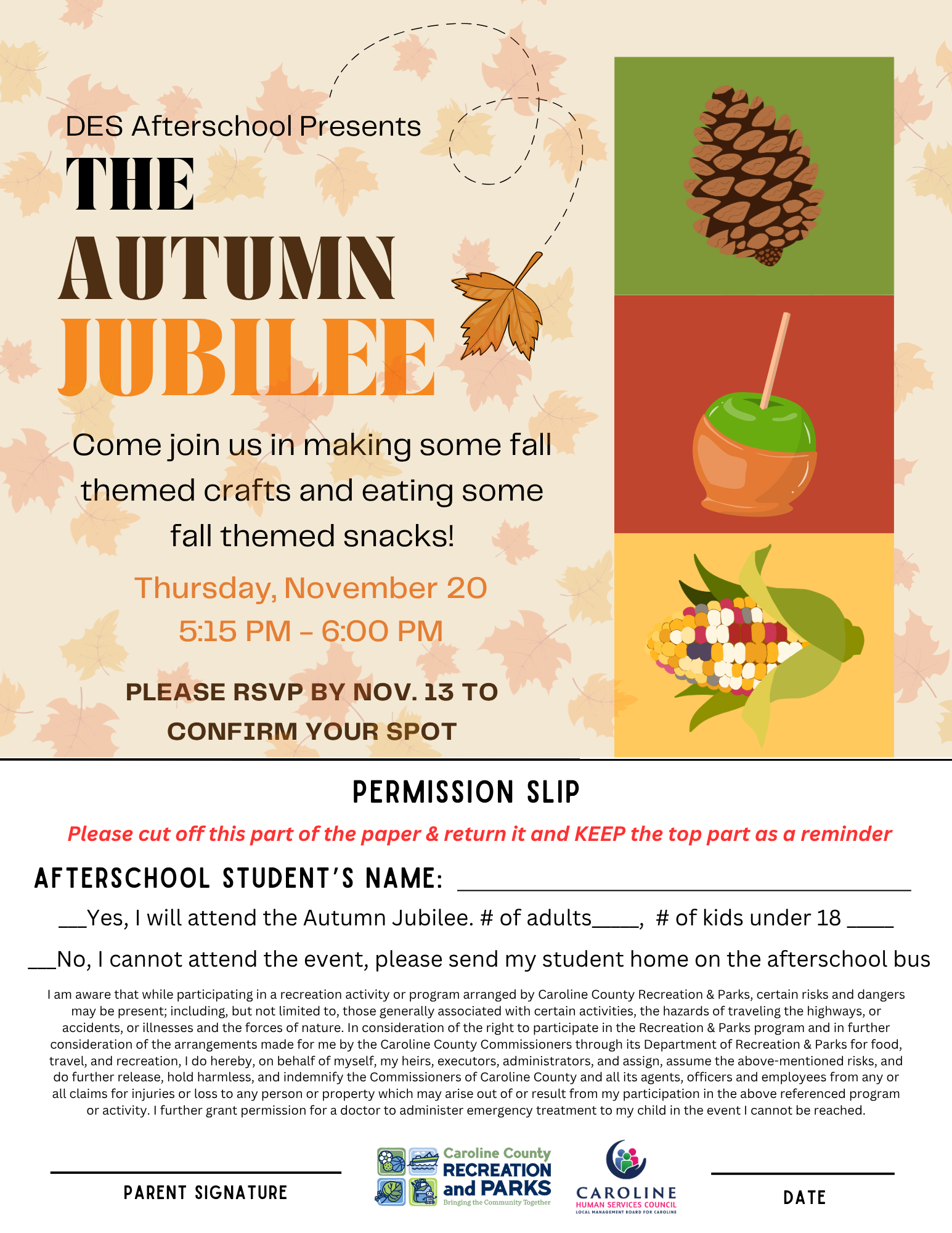 11/20/25: DES Family Night: Autumn Jubilee - 5:15pm - 6:00pm English Flyer | Spanish Flyer