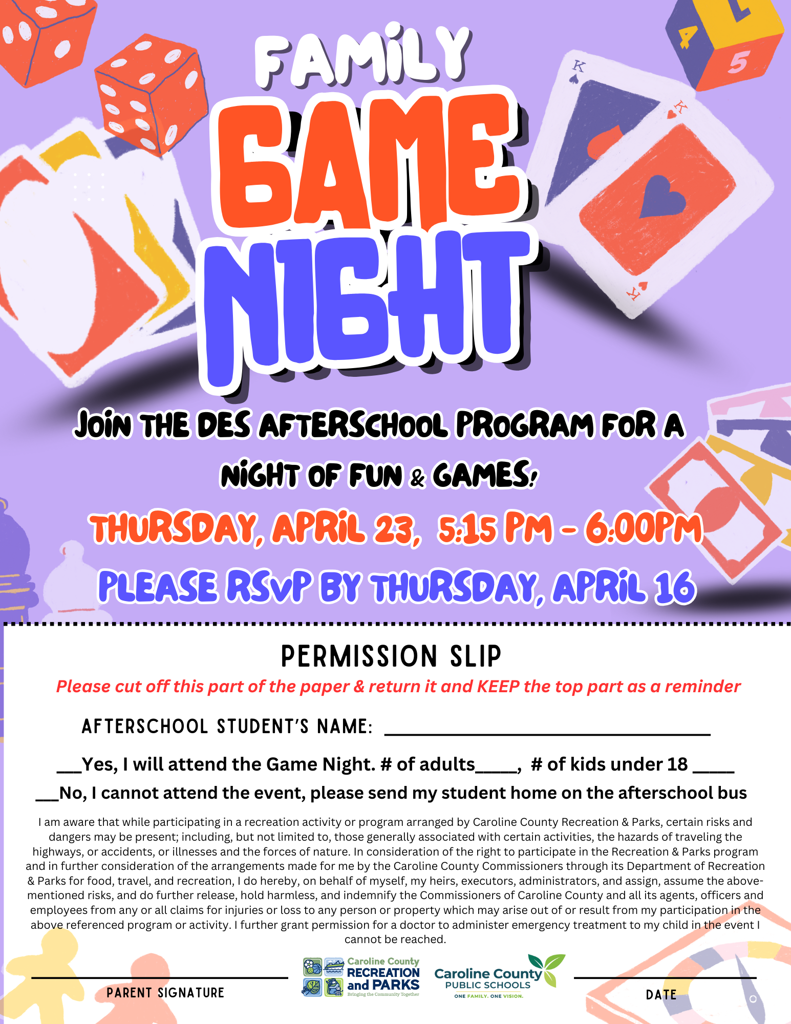 4/23/26: DES Family Night: Family Game Night - 5:15pm - 6:00pm English Flyer | Spanish Flyer