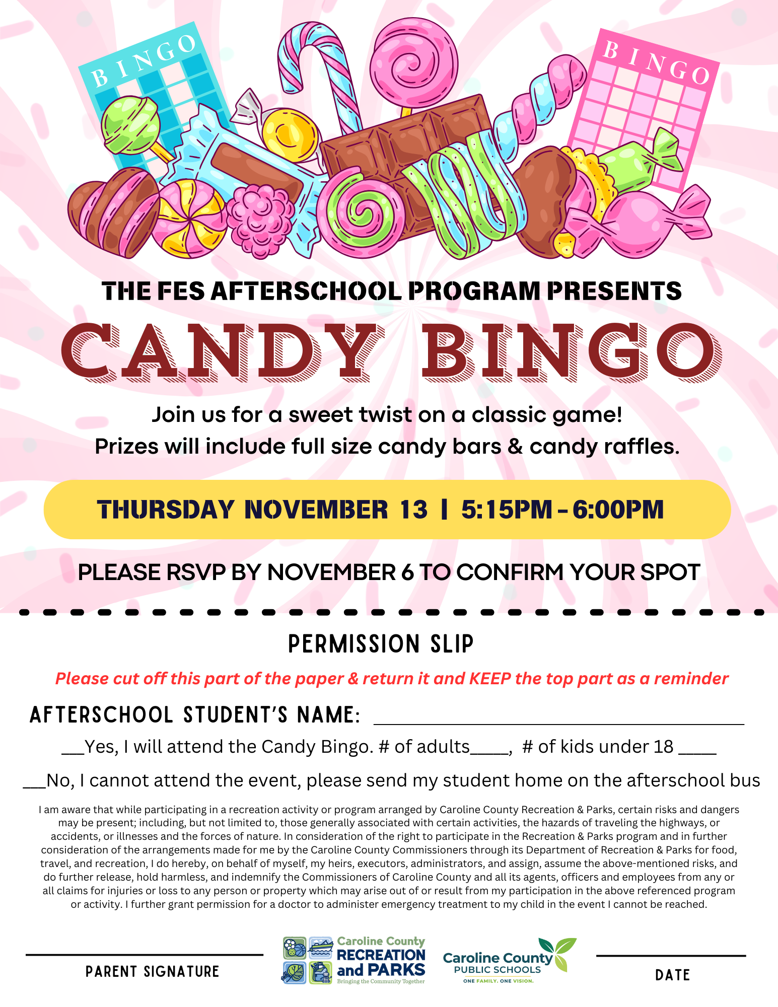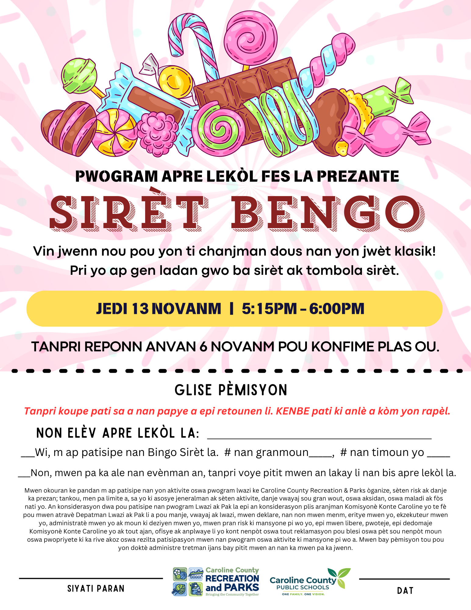 11/13/25: FES Family Night: Candy Bingo - 5:15pm - 6:00pm English Flyer | Haitian/Creole Flyer