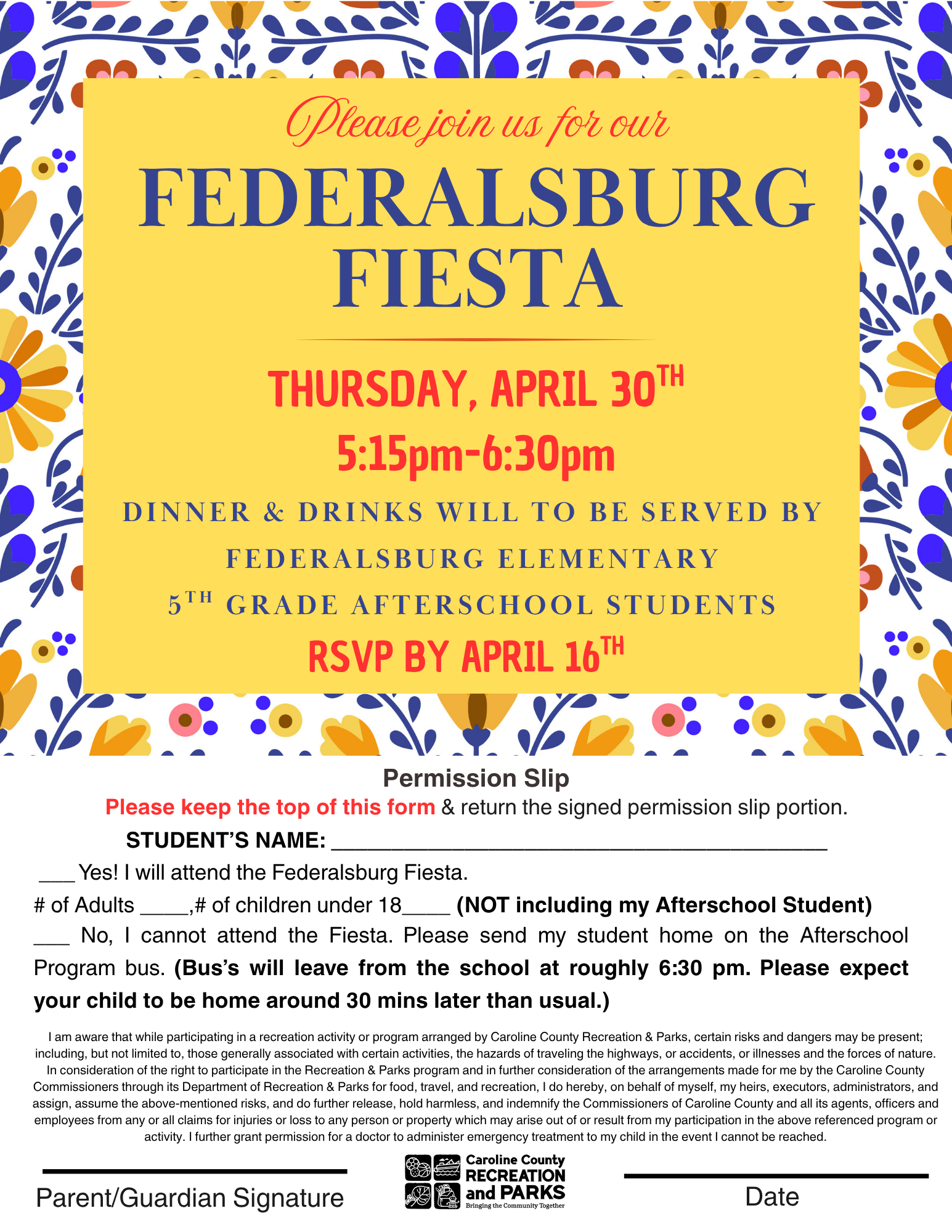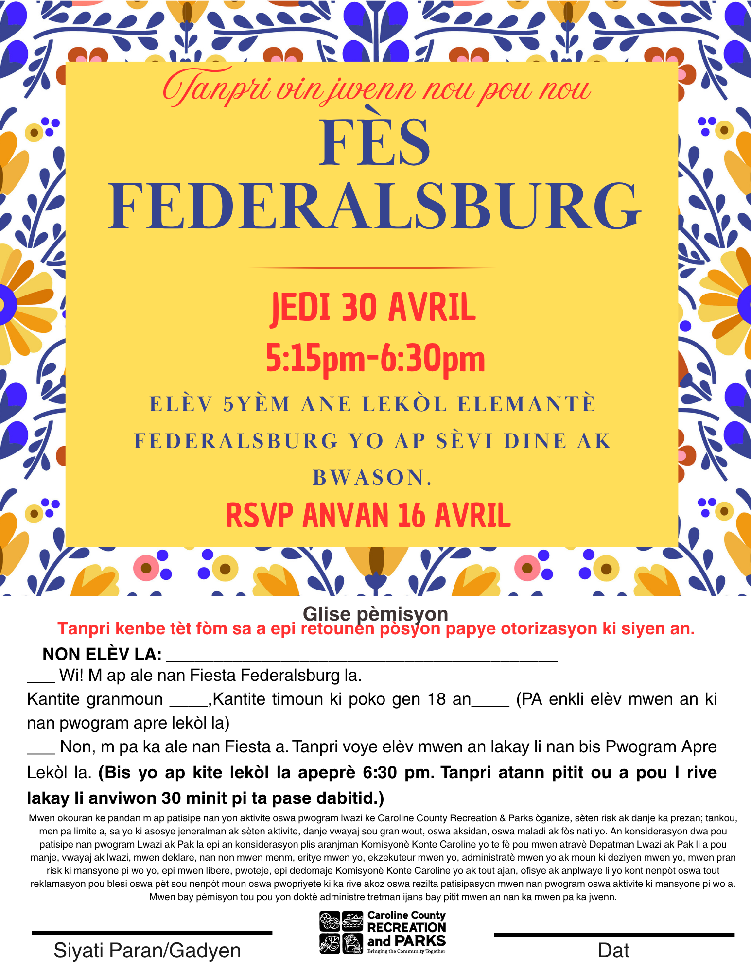 4/30/26: FES Family Night: Federalsburg Fiesta - 5:15pm - 6:30pm English Flyer | Haitian/Creole Flyer