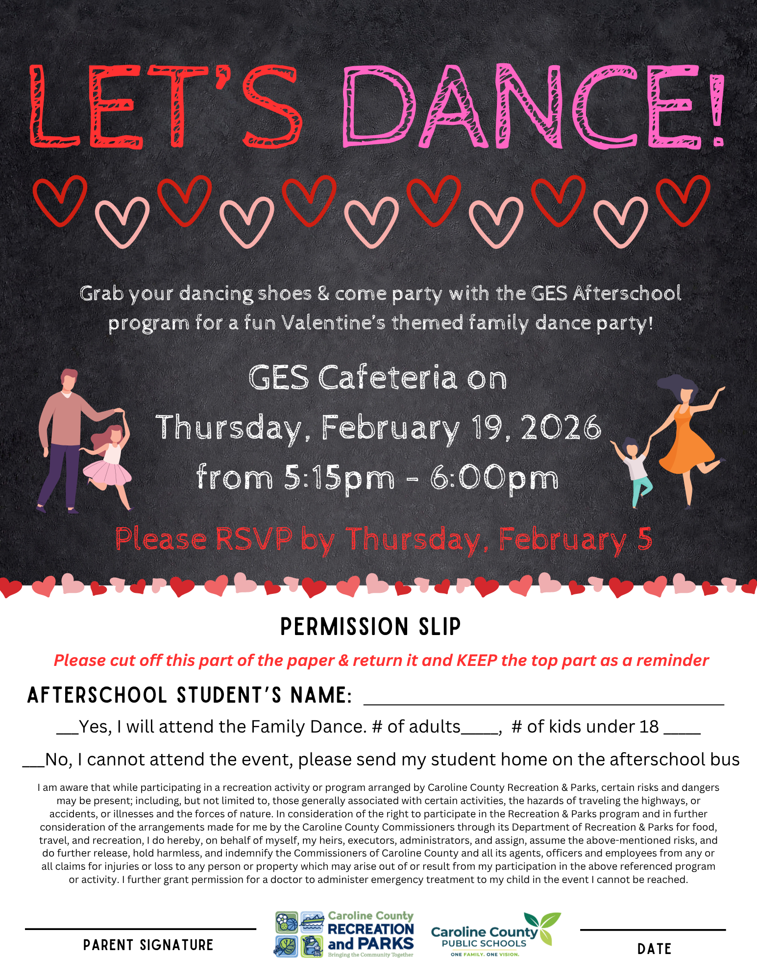 2/19/26: GES Family Night: Valentine's Dance - 5:15pm - 6:00pm English Flyer | Spanish Flyer