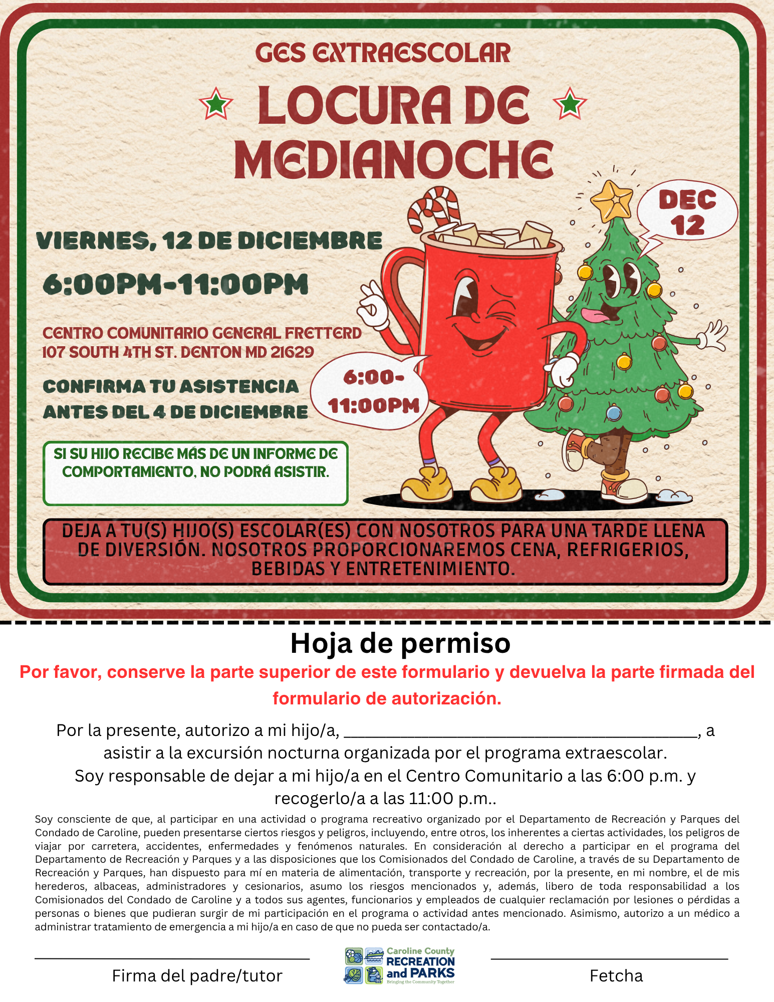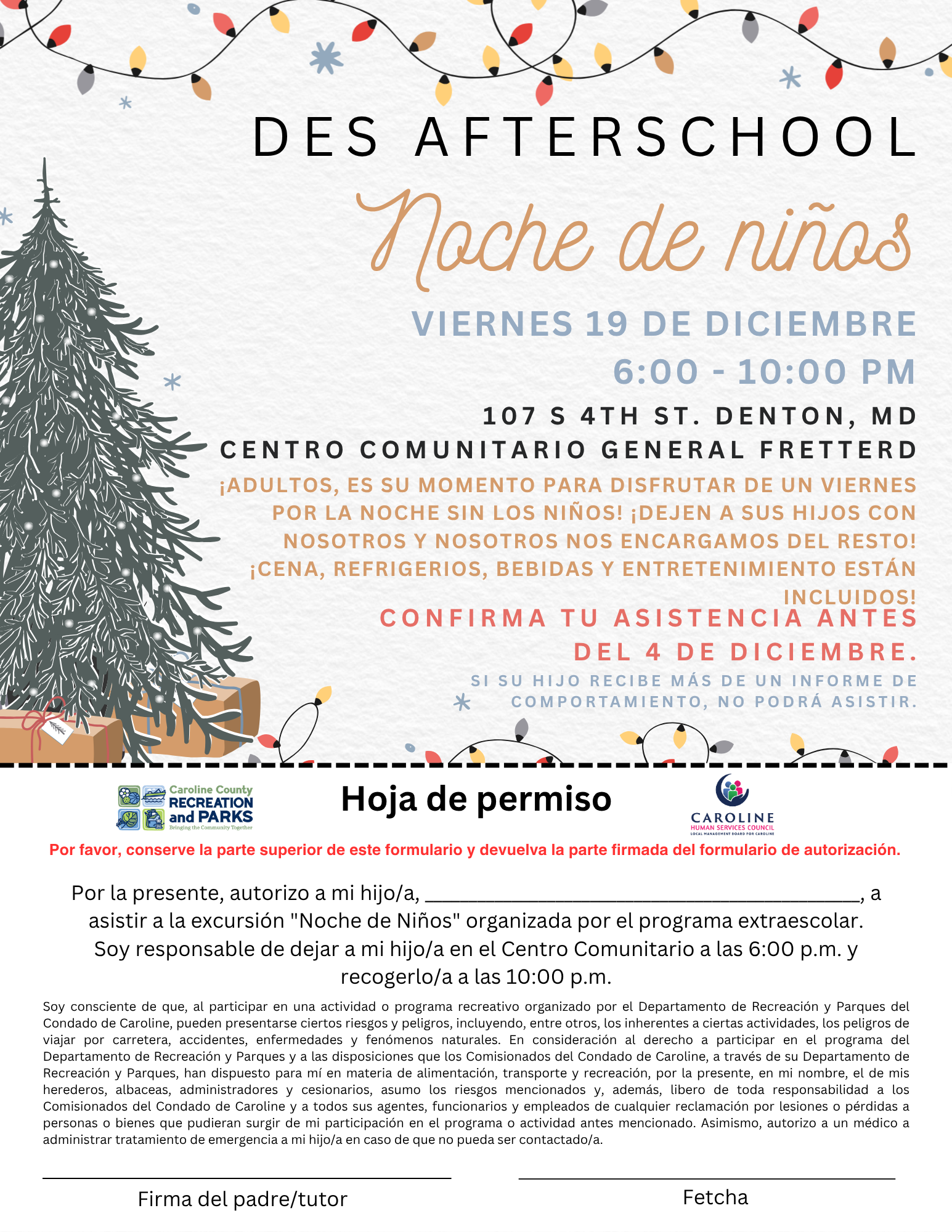 12/19/25: DES Kids Night Out Event English Flyer | Spanish Flyer
