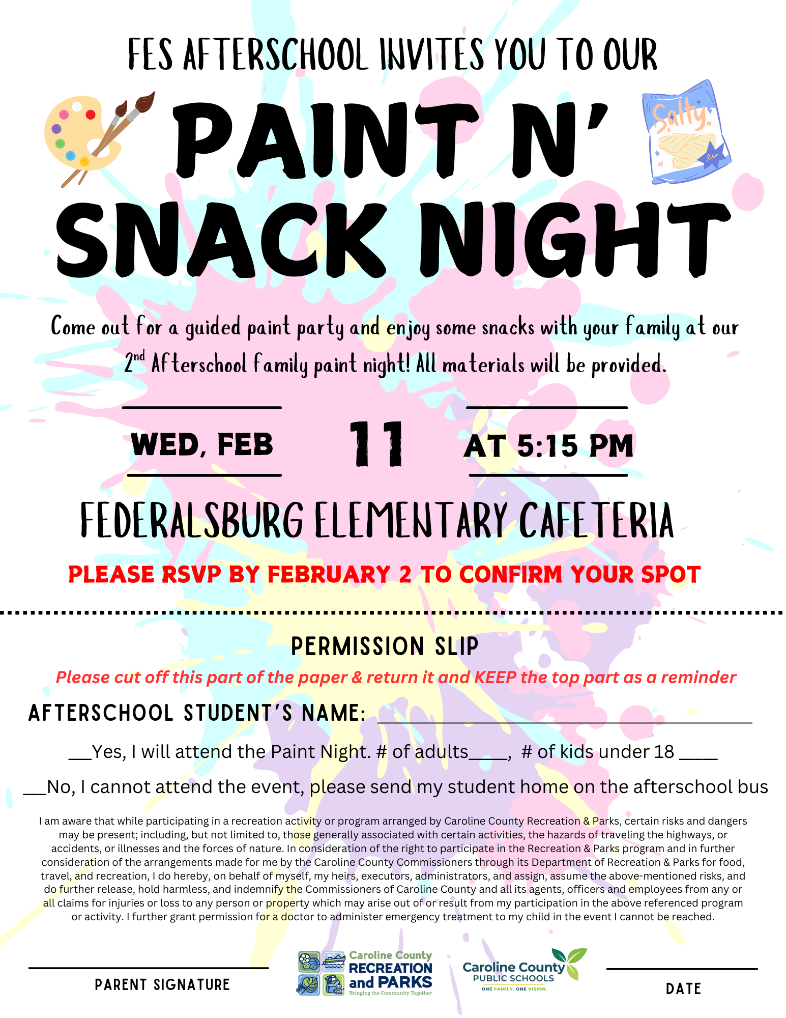 2/11/26: FES Family Night: Paint & Snack - 5:15pm - 6:00pm English Flyer | Haitian/Creole Flyer